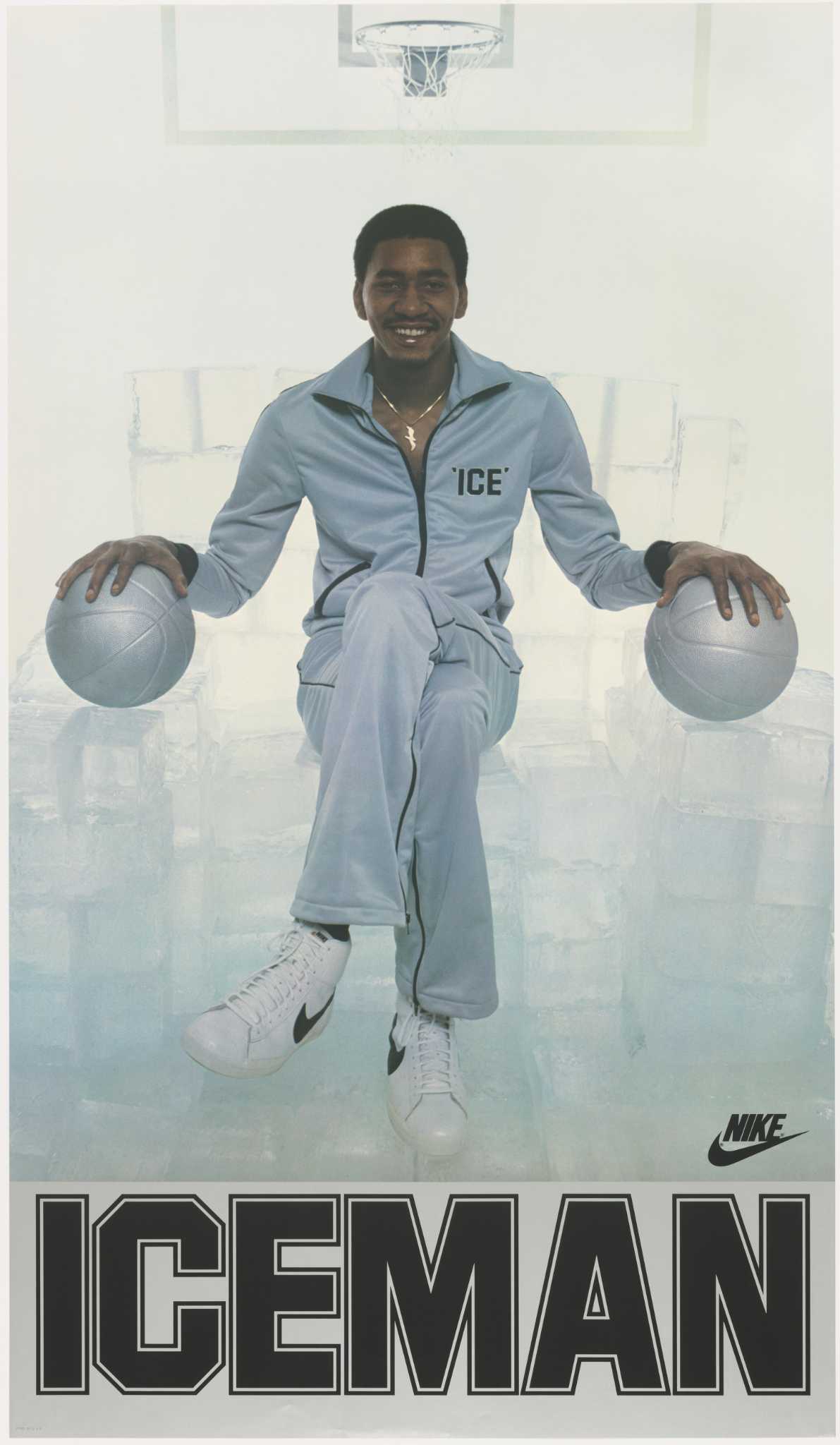 This design draws straight from the legendary “Iceman” poster from 1978 and shot by Denny Strickland . The icy colorway and silver accents echo Gervin’s throne of ice, while the high-shine finish recalls the silver basketballs in each hand and the original “ICE” tracksuit.